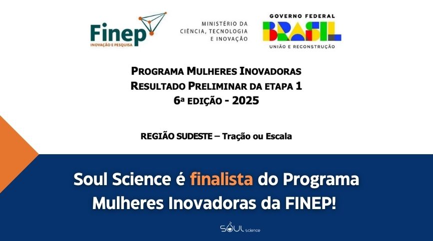 Reconhecimento que valida nossa missão: A Soul Science foi selecionada entre as startups de tração da FINEP no Programa Mulheres Inovadoras 2025 (Sudeste) e nossa diretora executiva venceu o 1º lugar do Prêmio Sebrae Mulher de Negócios (RJ) em Ciência & Tecnologia.